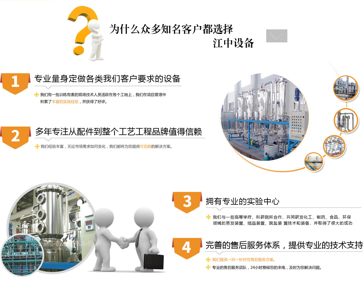 江陰市江中設備制造有限公司是一家專業(yè)從事蒸發(fā)、濃縮、提取、污水處理等設備的廠家。廣泛應用于制藥、化工、食品、農副產品深加 冶金、電子等多個領域。產品遍及全國三十余個省、市、區(qū),并遠銷歐美及東南亞一些國家和地區(qū)。公司實力雄厚,匯聚了一批高層次、高素質 的專業(yè)人才,一直致力于產品的開發(fā)、生產和管理,并十分注重科技創(chuàng)新,所生產的設備受到用戶的青睞。